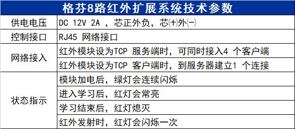 ●38KHZ红外载波; ●8路独立的红外发送接口; ●每一路红外接口支持40个红外信号; ●支持通过232调用内部学习好的红外代码; ●支持8路独立红外输出; ●支持自带学习功能,红外文件可保存; ●支持232控制红外输出; ●选配网络控制功能。