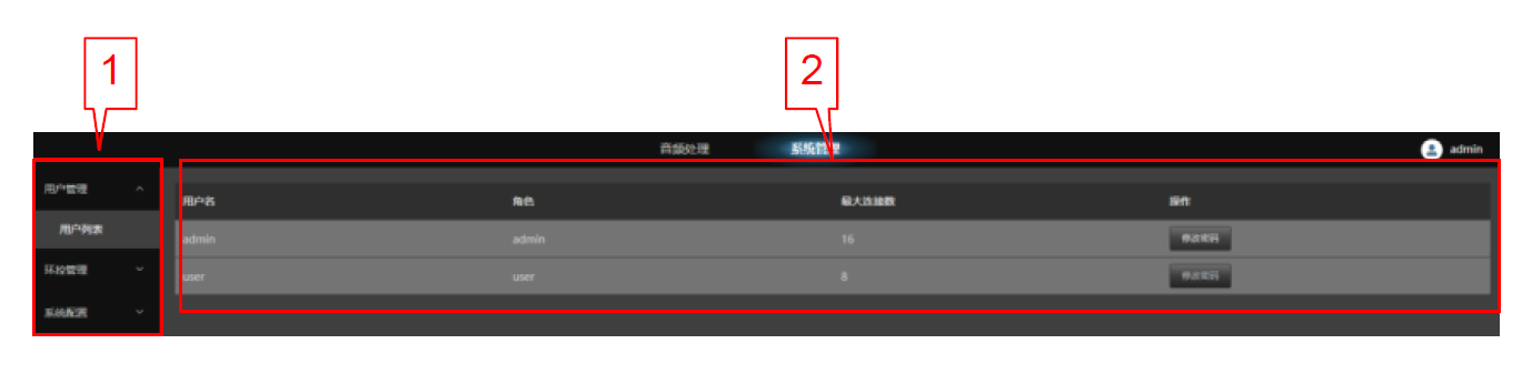登录成功后,设备功能分为两大模块,音频处理和系统管理,如下图所示: