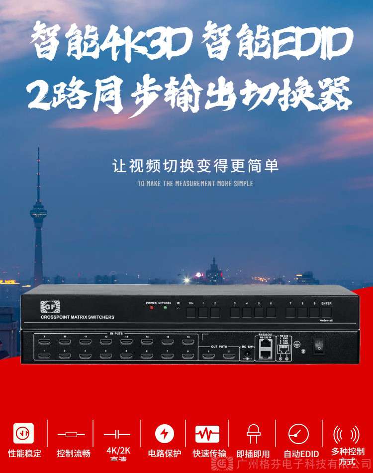 HDMI 16路自动切换器2路同步输出GF-HDMI1602是一款功能全面、性能稳定的高清视频信号切换设备。它支持多信号源输入和双路同步输出,具备自动切换功能和高分辨率支持等特点,广泛应用于大型会议室、监控中心、多媒体教室和家庭影院等领域。在选择时,用户应关注产品的技术规格、性能表现以及价格等因素,以确保选购到符合自己需求的设备。