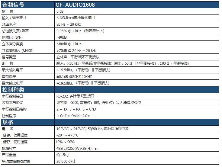 ●GF-AUDIO1616 16路音频输入,16路音频输出,可完全交叉切换