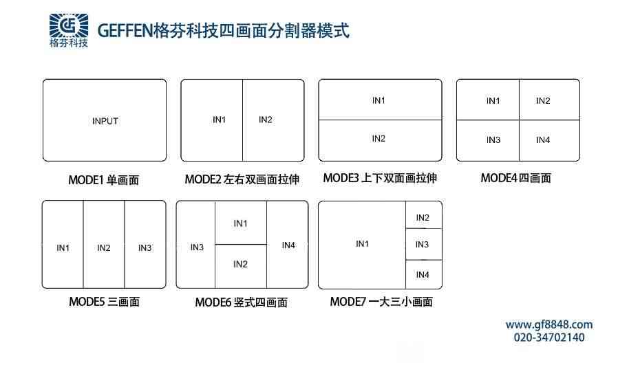 GEFFEN(格芬)作为专业的视频信号处理和传输解决方案提供商,其画面分割器很可能支持多种画面分割模式,以满足不同用户的需求和应用场景。虽然具体的产品型号和功能可能有所不同,但根据画面分割器的一般特性和GEFFEN的品牌定位,可以合理推测其画面分割器具备以下多种画面分割模式支持: