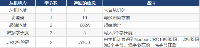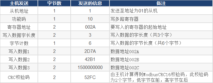 例如:主机要把数据2D7A、42B1、15E8保存到地址为002A、002B、002C的从机寄存器中去(从机设备地址为01)。