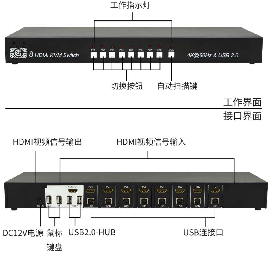 HDMI KVM 8进1出4K切换器 能够使用户从单一USB键盘、鼠标、和一个HDMI视频信号接口,快速切换操作2台4台、8台电脑主机,以便有效率的进行多工作处理;