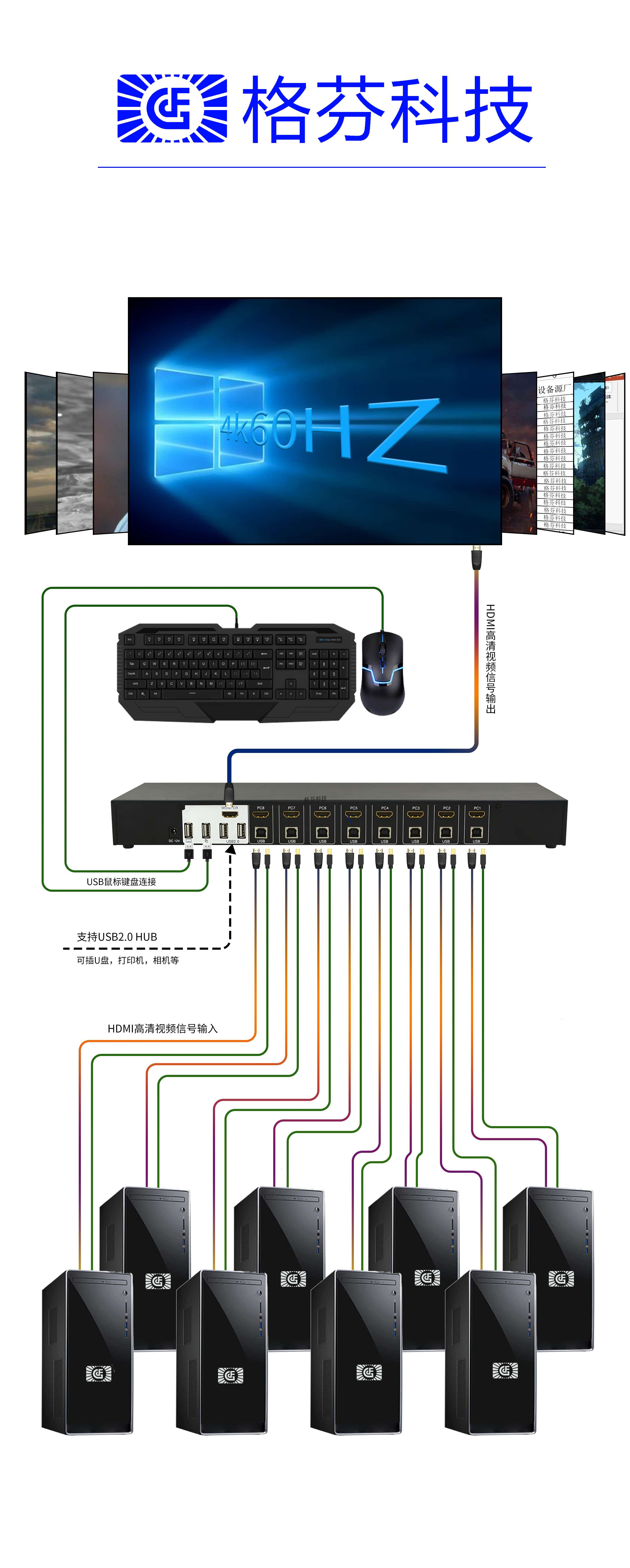 1. 能够使用户从单一USB键盘、鼠标、和一个HDMI视频信号接口,快速切换操作2台4台、8台电脑主机,以便有效率的进行多工作处理;