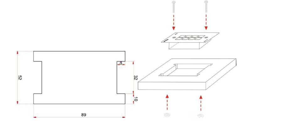 本产品可直接嵌入安装在墙上或桌面, 根据下图开孔尺寸,在桌面或墙壁开一个大小合适的孔,孔深至少25mm,注意后面板四颗螺丝位置与高度。