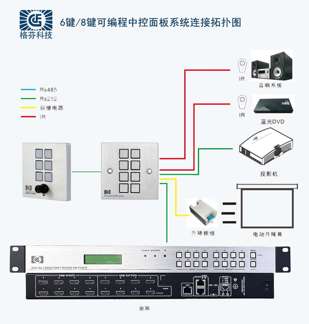 每个按键都可以通过串口RS232 和RS485 对外围设备(摄像机、投影机等)进行可编程控制。