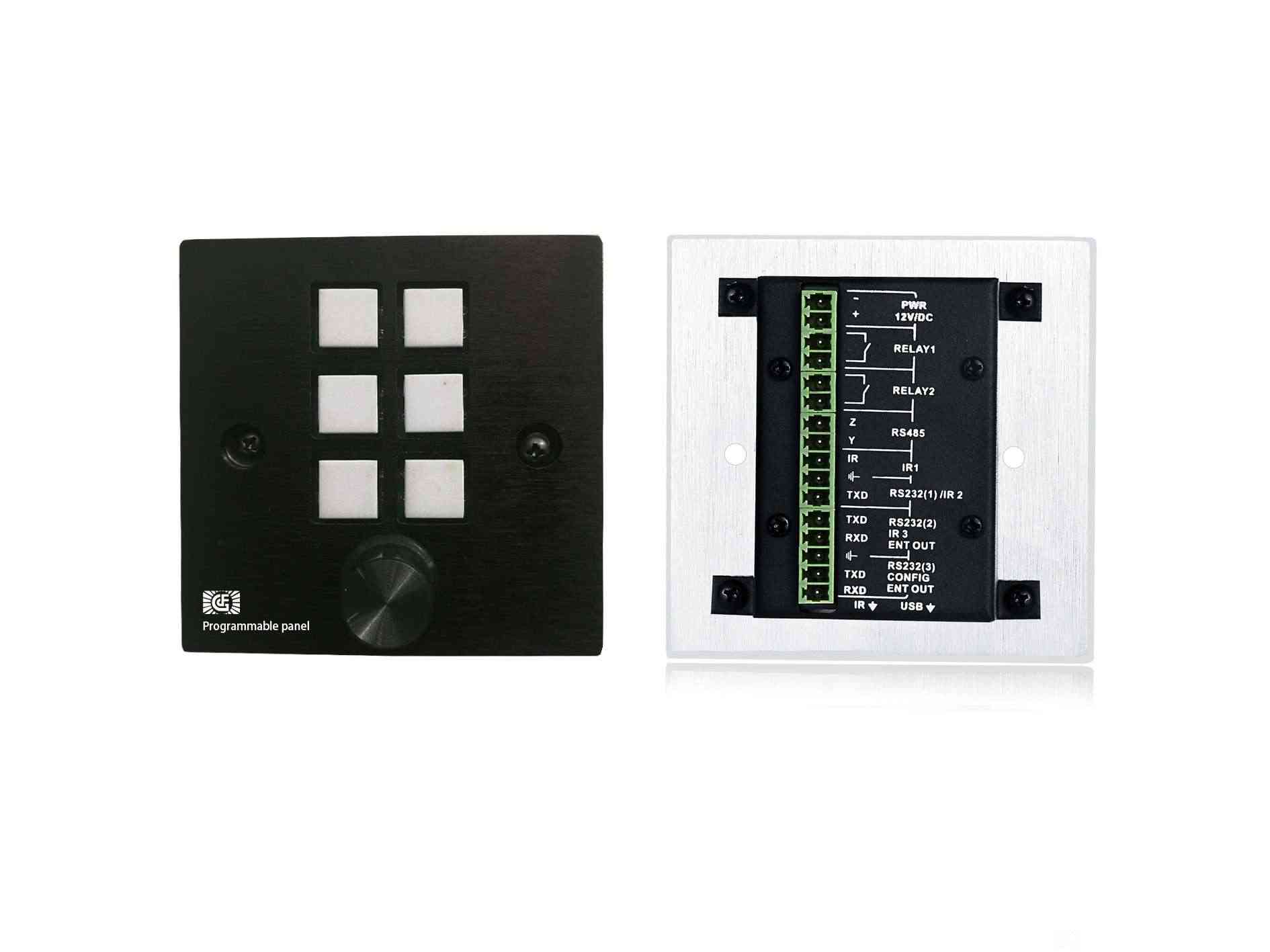 GEFFEN 中控系列GF-PR8,该款可编程按键控制面板,具有8个可调光LED水晶按键,每个按键都可以按工程的实际情况进行编程设置,同时各按键之间可以相互影响也可独立使用。它接口丰富: RS232端口3路、 RS485端口1路、红外发射端口3个、继电器控制端口2路,方便控制各种设备。它简易实用、安全可靠控制方式,是您在会议室、展示厅、教室、多媒体教室等工程项目中的好帮手。