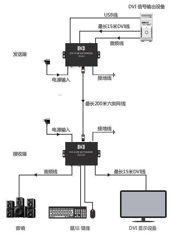 使用DVI标准线缆,输入/输出传输距离可达15米;