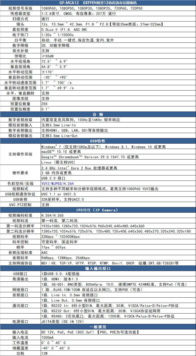●编码:H.265/H.264/MJPEG,网络协议:IPv4, TCP, UDP, HTTP,NTP,DNS, DHCP,ARP, RTSP, RTP,RTCP, RTMP,NDI,ONVIF,VISCA OVER IP,