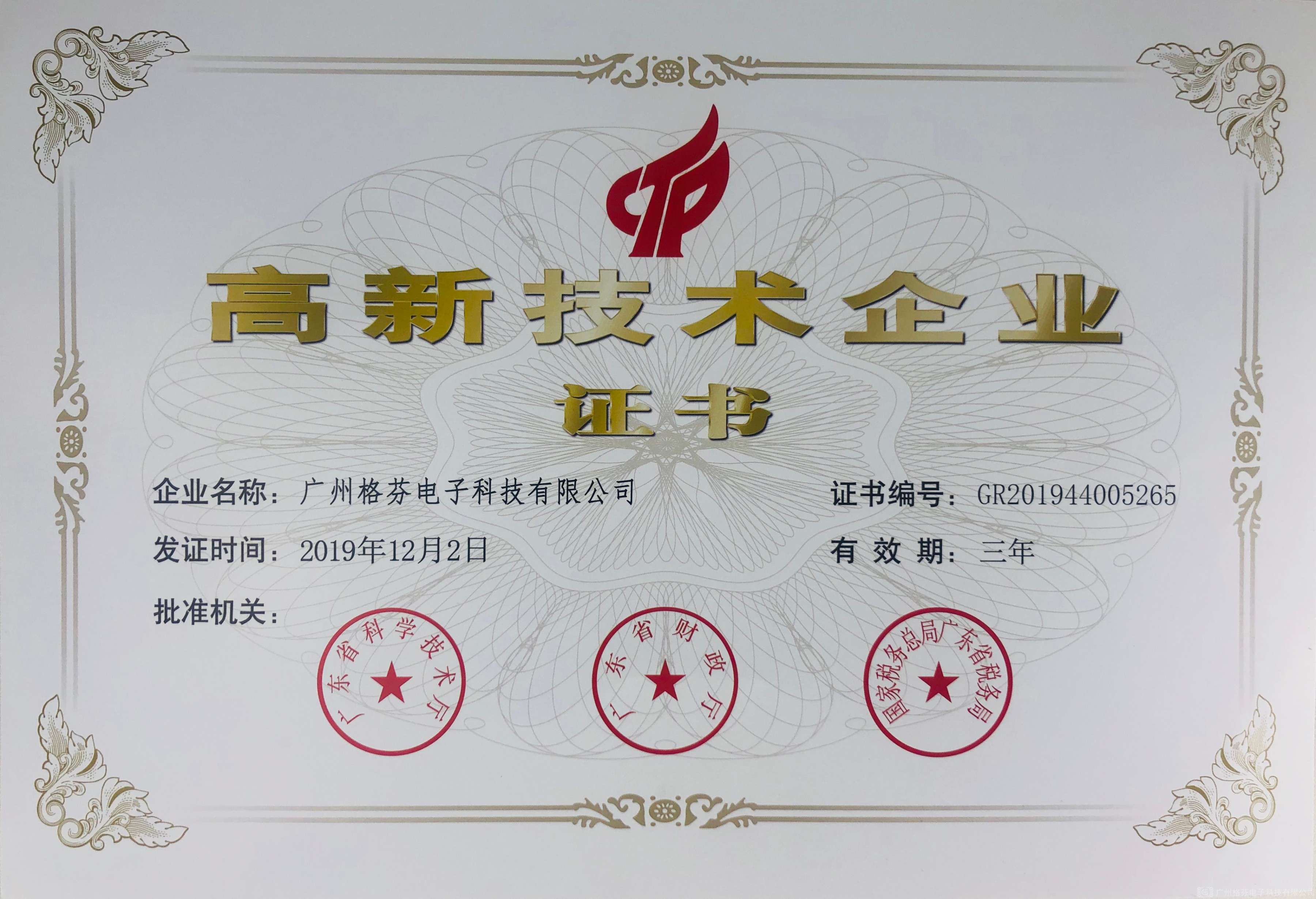 广州格芬电子科技有限公司连续9年顺利通过广东省高新技术企业认定工作,荣获了由广东省科学技术厅、广东省财政局、广东省国家税务局和广东省地方税务局联合颁发的《高新技术企业证书》以及顺利通过中国质量认证中心CCC产品认证监督审核。
