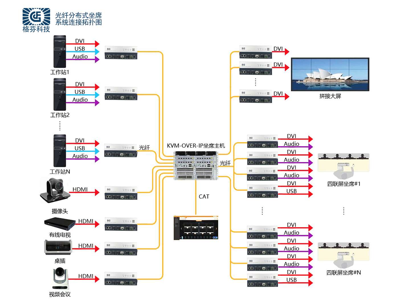 光纤KVM与分布式IP KVM最核心的区别在于产品架构,分布式IP KVM系统以网络交换机为信号传输的核心,而光纤KVM使用了被称为“全光架构”的产品核心,省去了网络交换机,具有完全不同的产品结构。全光架构为控制室坐席管理系统带来了以往的技术前所未有的优势,也为控制室带来了革命性的效率提高与操作体验。