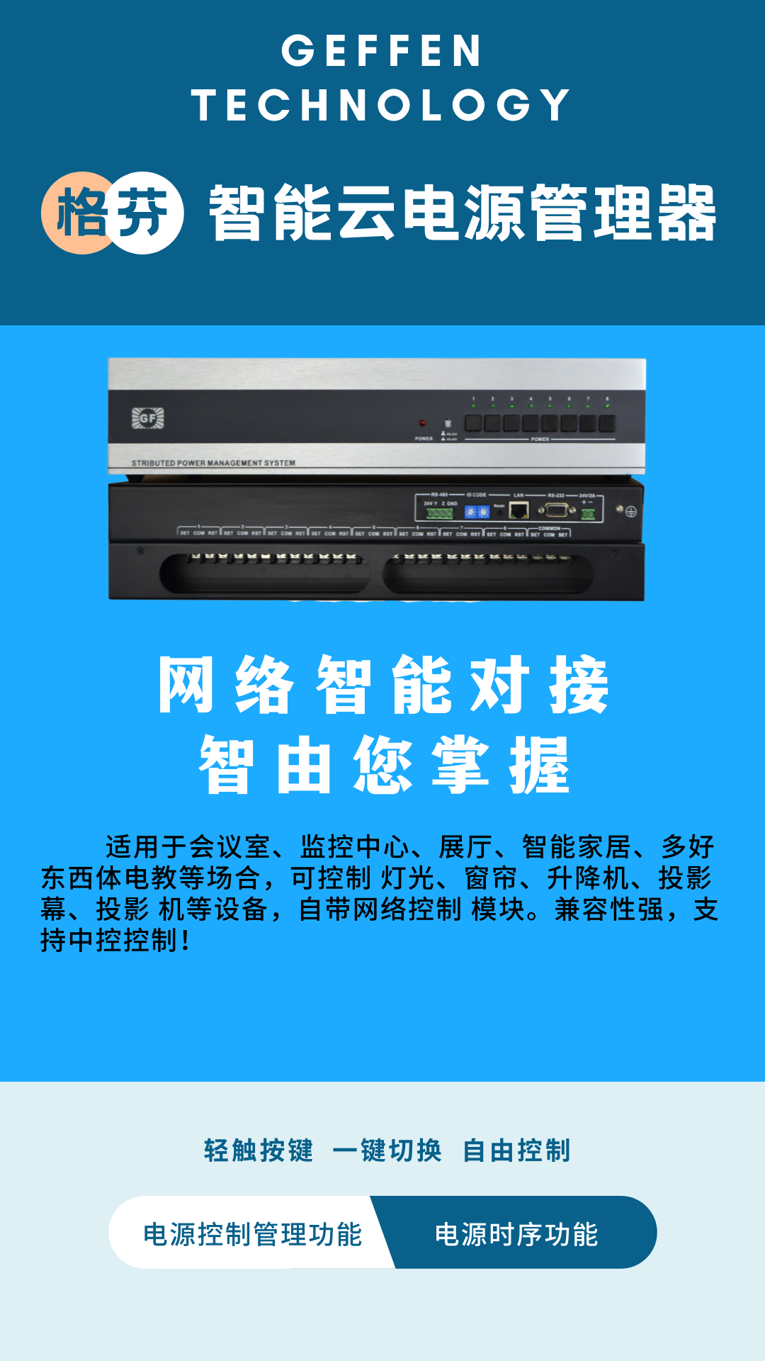 GEFFEN 电源管理器系列GF-SPMS8机架式八路智能电源控制器,具有1路LAN接口,接入网络接口,让你的设备布局充满想象。可搭配可编程主机或PC机通信实现多种周边设备的控制。如用于控制灯光,音响时序器,电动屏幕,电动窗帘及投影机等外设供电电源。
