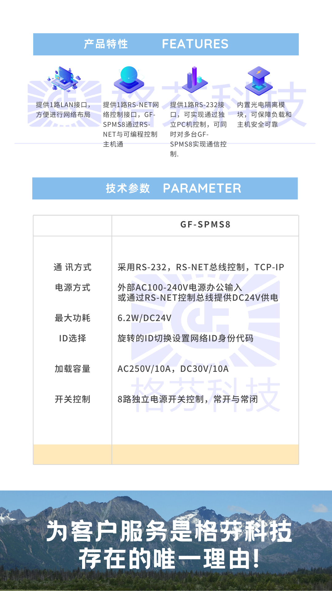 GF-SPMS8智能云电源管理器通过LINK协议或者232通信协议与中控主机进行通信,通过继电器原理,达到弱电控制强电的目的,主要运用于控制设备开关,投影机延时关机,电动屏幕、电动窗帘、电动吊架的升降控制等。内置网络控制功能集成WEB GUI界面,随时的通过各种移动设备控制。