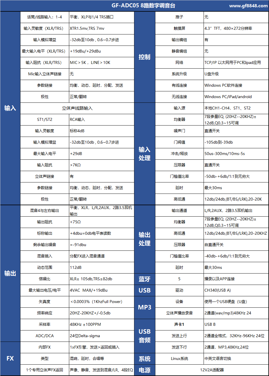 •输出内置7段参量EQ均衡,压限器,高低通滤波器,延时,相位