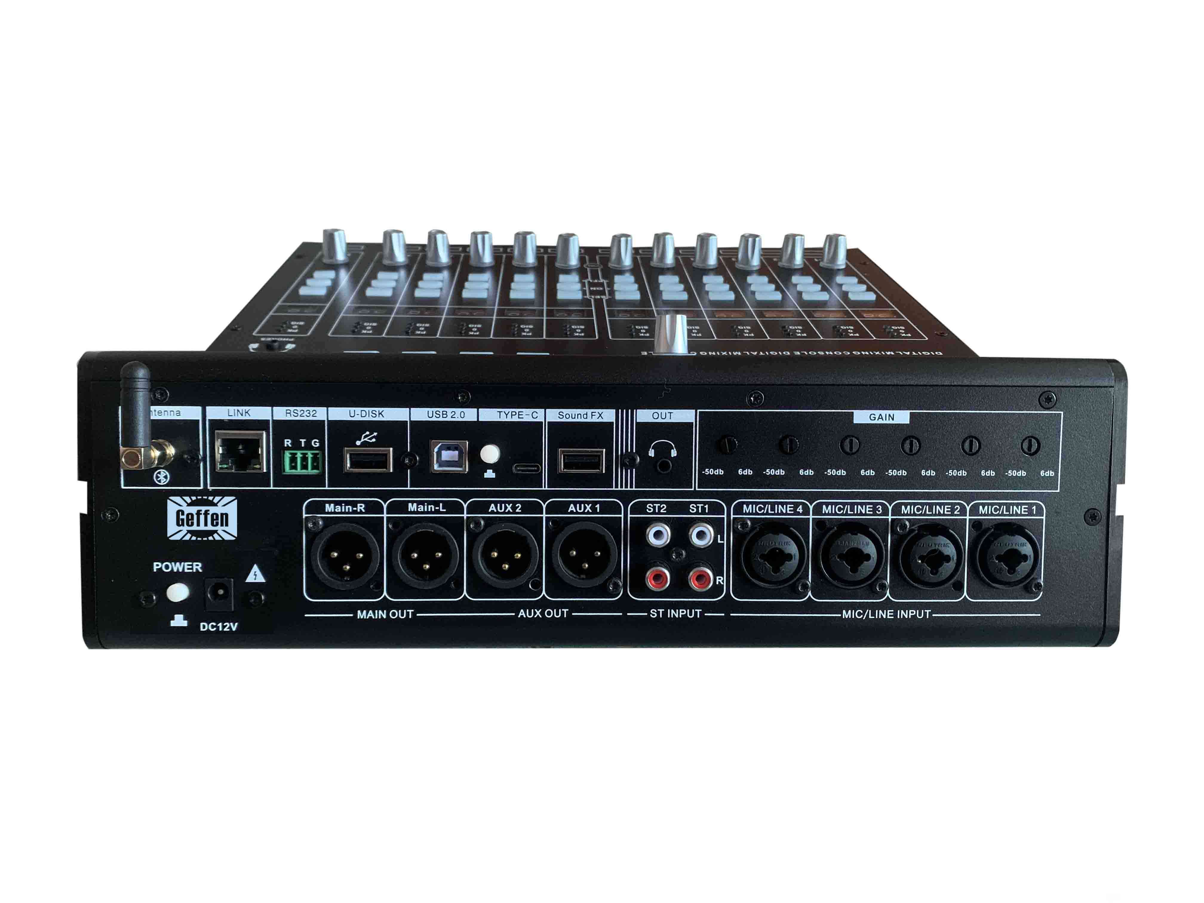 11、通道音量旋钮(左侧为通道1-4,两路立体声输入,右侧为蓝牙输入,声卡输入,效果通道,两路AUX辅助输出以及主输出)