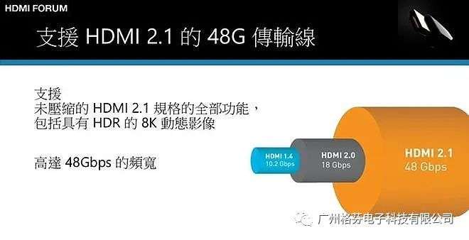 2017 年 1 月推出的最新 HDMI 2.1版本,HDMI 2.1最大的特点是传输带宽从18Gbps大幅提高到48Gbps,支持动态HDR、音频回传通道(eARC)、可变刷新率(VRR)、快速媒体切换(QMS)、 快速帧传输(QFT)、自动低延迟模式(ALLM)、VESA DSC 1.2a等新技术;可以支持高达 7,680 × 4,320/60Hz(8K/60p) 的影像,或者 4K/120Hz 的更高帧率影像。HDMI 2.1 将会继续对应返原有的 HDMI A、C 及 D 等几种插头设计。而且支持新的 Dynamic HDR 技术,比起现时的“静态”HDR,“动态”HDR 可以因应每一格画面的光暗分布进一步提升对比同光暗层次表现。音效方面,HDMI 2.1 支持新的 eARC 技术,比起现有的ARC(Audio Return Channel),可以回传 Dolby Atmos 等 Object-based 音效。