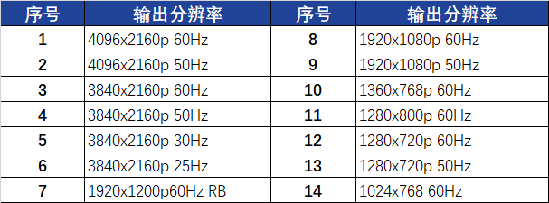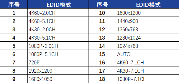 用户可以通过串口命令或OSD 菜单选择以下EDID 模式