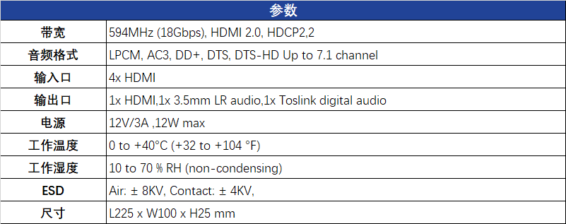 切换器支持最大输入分辨率3840x2160@60, 支持多种音频格式,比如LPCM, AC3,DD+, DTS, DTS-HD, 最大到7.1 声道, 支持音频独立选择.