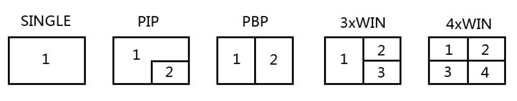 ● 5 种开窗模式,PBP、 3xWIN、 4xWIN、 SINGLE、 PIP,