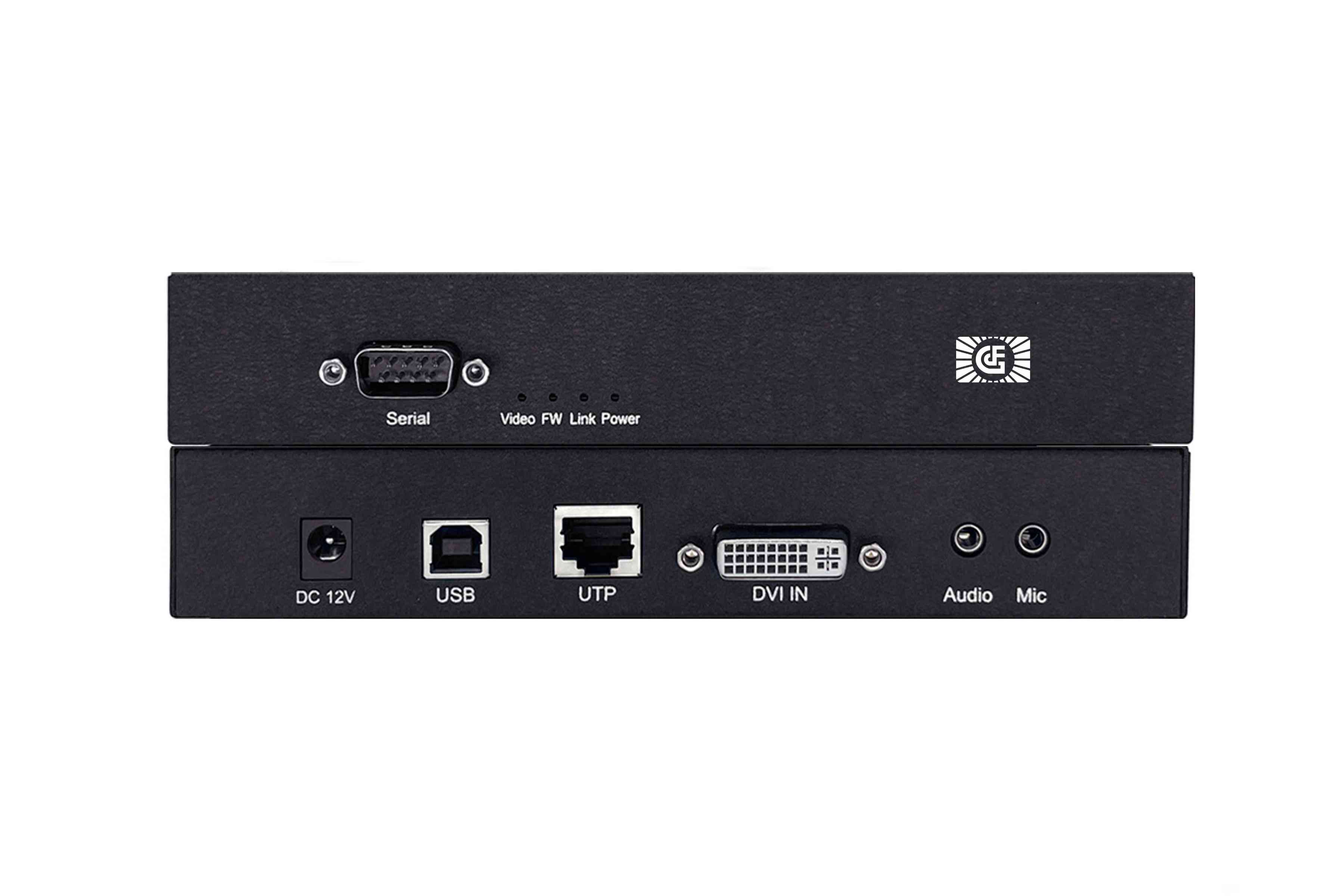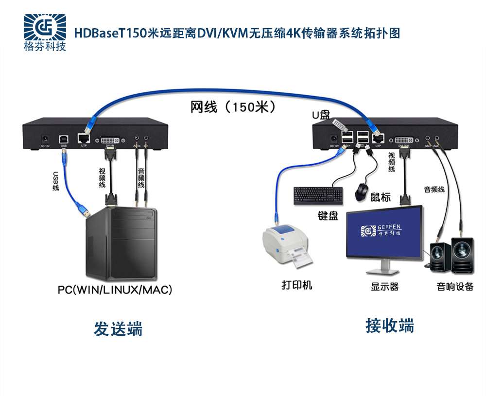 格芬HDBaseT远距离DVI/KVM无压缩4K传输发射接收器集成HDBaseT数字无压缩(非压缩)技术,DVI﹑USB﹑RS232及音频、耳麦信号可以通过单根CAT5e/CAT6a电缆将信号延⻓输出⾄70⽶,用户可以在远端使用电脑。该产品由本地端和远端组成,成对使用。该传输系统使用HDBaseT数字无压缩(非压缩)传输技术,最高视频解析度可达4KX2K(3840×2160@30Hz)。