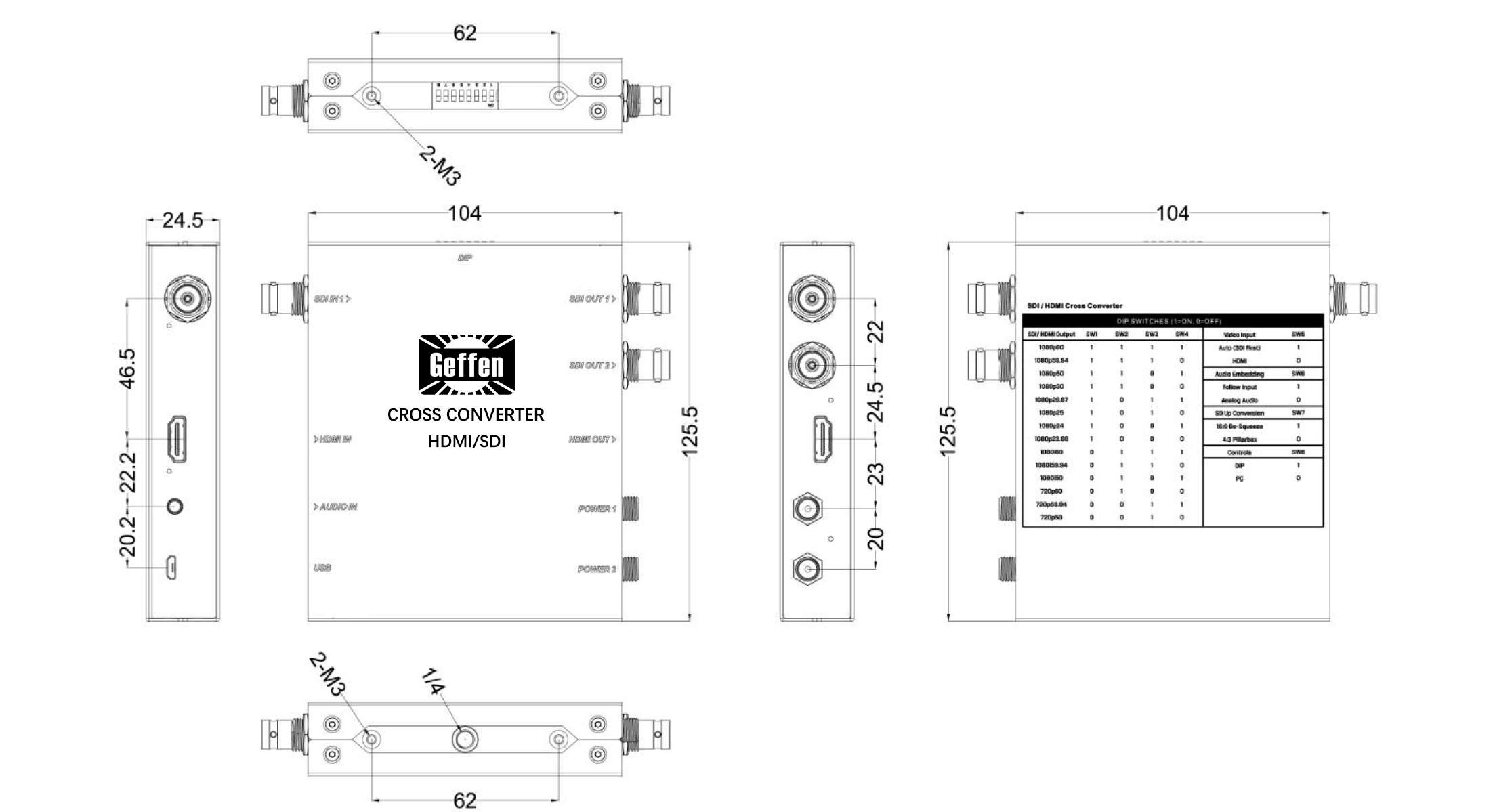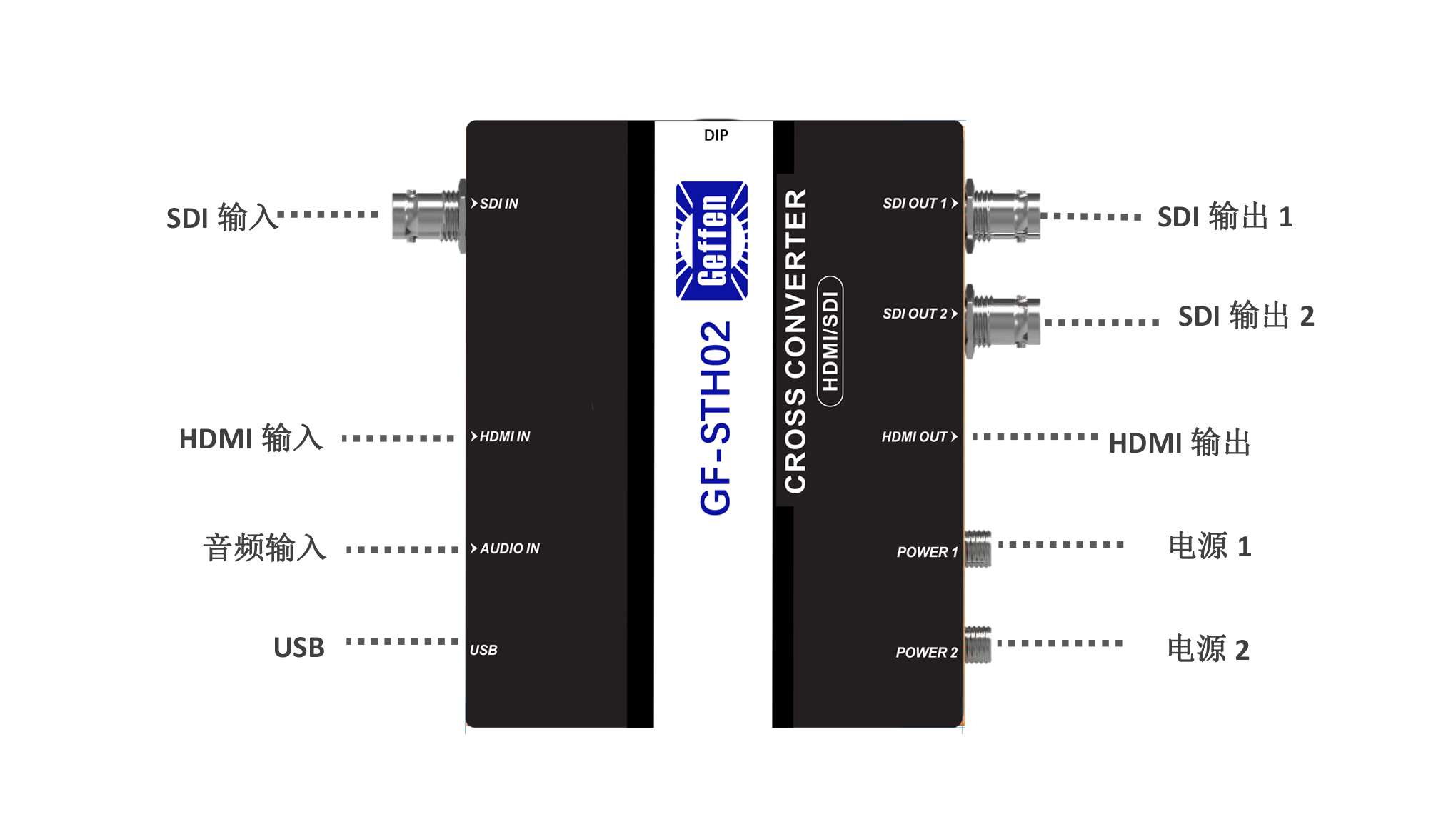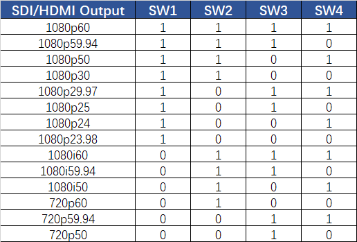 ●DIP SW 1-4 - SDI/HDMI 输出格式设置开关,实现输出的上下比例调整和帧率转换。