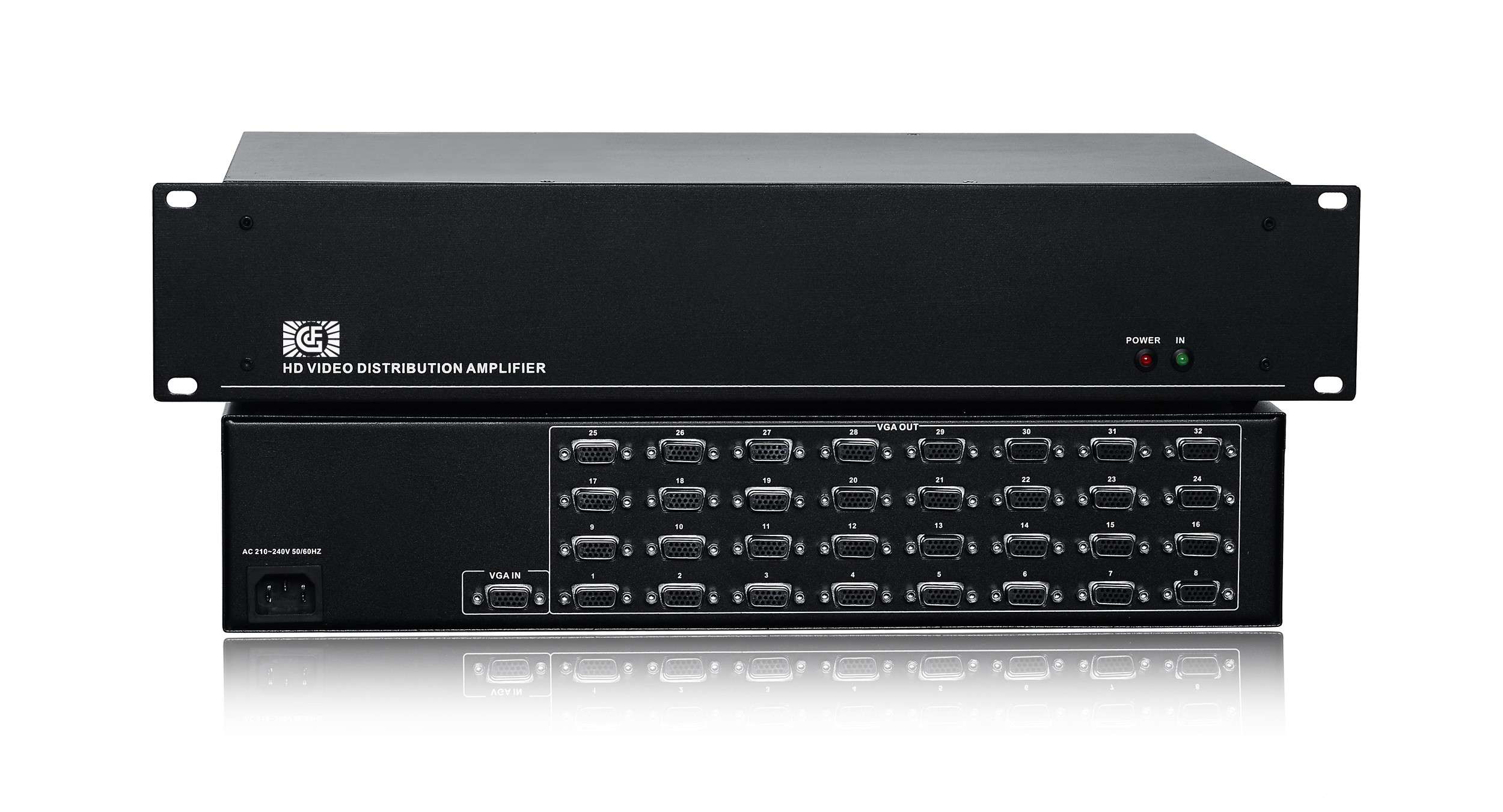 HDV-1:32分配放大器,是一款高性能的电脑信号的分配设备,1路VGA输入,同时24/32路VGA输出.用于一个电脑信号驱动多个显示屏。独立的RGBHV输入,每路信号分量单独传输,单独放大。使信号传输衰减降至最低,使图像信号能高保真输出