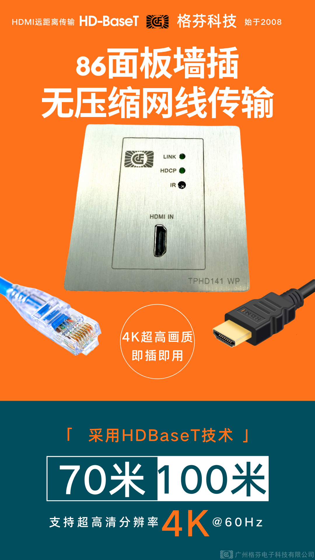 通过Cat6双绞线,可实现长达70~100米的信号传输,远远优于目前的HDMI、VGA、Display-Port标准,是较远距离传输上的不二选择。常见如投影机、电视、混合矩阵、高清播放器等。支持POC/POE功能。, 设有HDMI输入接口,将接收的HDMI信号转换为HDBaseT格式,并通过RJ45接口输出。同时GEFFEN格芬科技GF-TPHD桌插/插墙/地插系列还支持红外输入和RS232输入,可同时将IR信号以及RS232信号与HDBaseT信号一同输出给接收端。