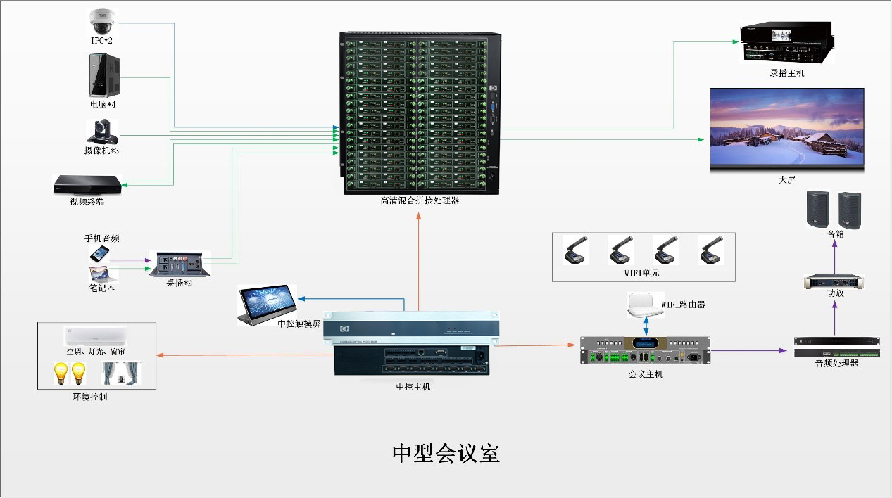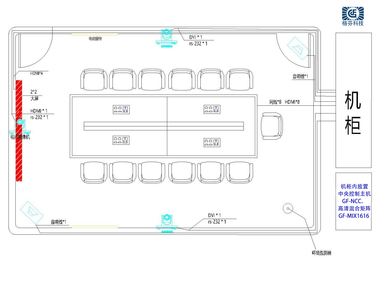 在会议室建设一套信号管理系统,主要作用为音视频信号传输。高清混合拼接矩阵系统应具备有音视频信号矩阵切换功能,远距离互联互通传输功能,视频拼接处理功能功能。