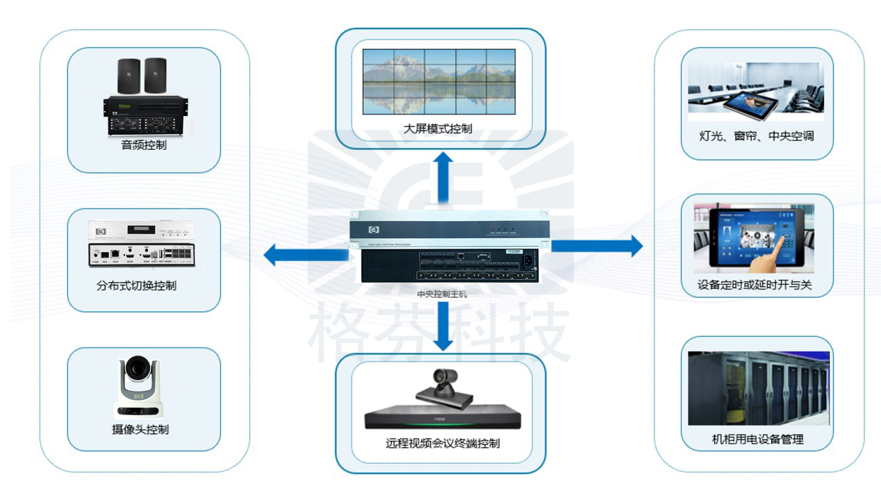 控制部分采用智能中央控制主机作为整个控制系统的核心,具有完全可编程的功能,开放式的编程架构,可根据需求进行复杂的逻辑运算(加减乘除运算、触屏密码授权登录、定时开关机、内部存储记忆数组和调用存储数组代码进行控制周边设备;支持显示系统控制,图像IP化系统控制、高清矩阵切换设备控制、摄像机控制、音频处理器控制、电源控制、房间环境(灯光、窗帘等)控制等功能,兼容各设备厂家控制协议;