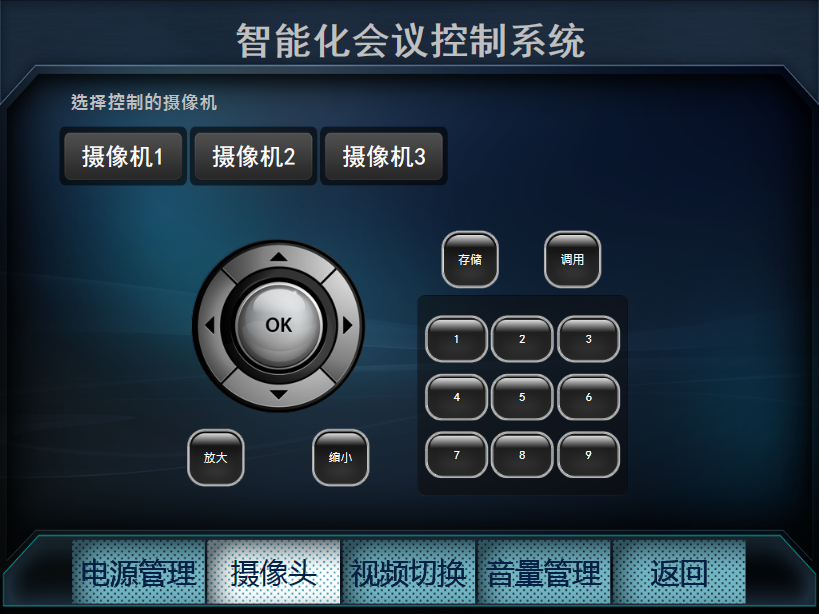 摄像机控制:中控主机通过RS232的方式可以控制投影机开关、信号切换,中控系统可以对摄像球机实现会议摄像跟踪的功能
