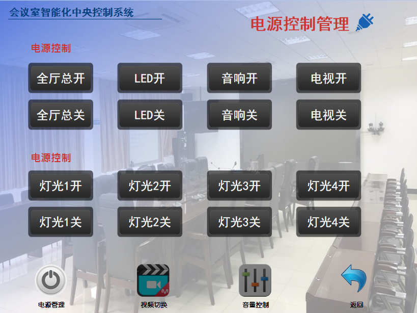 电源控制:支持管控会议室的设备电源开关,灯光开关、灯光亮度调节等,可对设备用电情况实时监测,包括电流、电压、功率。