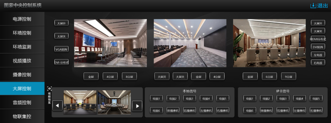 支持中控对接矩阵信号管理系统,实现对矩阵系统的音视频信号切换,预案调用大屏拼接模式等功能。