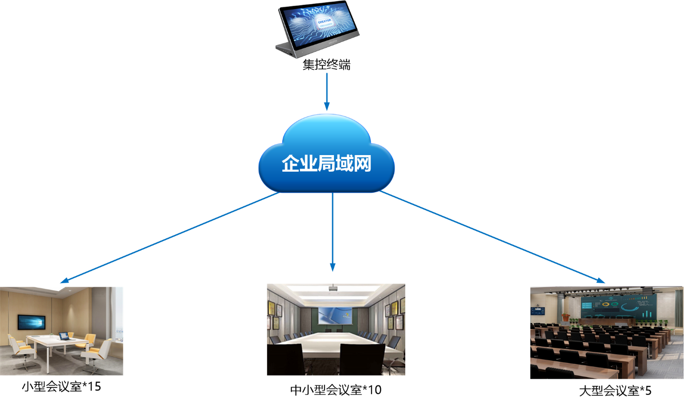 触控端可以对多个房间进行实时集中的控制,集控网络采用单位内部局域网,在需要管理的房间部署一台网络可编程媒体终端平台,在任意一个房间的触控端都可以通过局域网或者企业专线,对其他房间的设备集中管控,一键式开启和关闭系统。