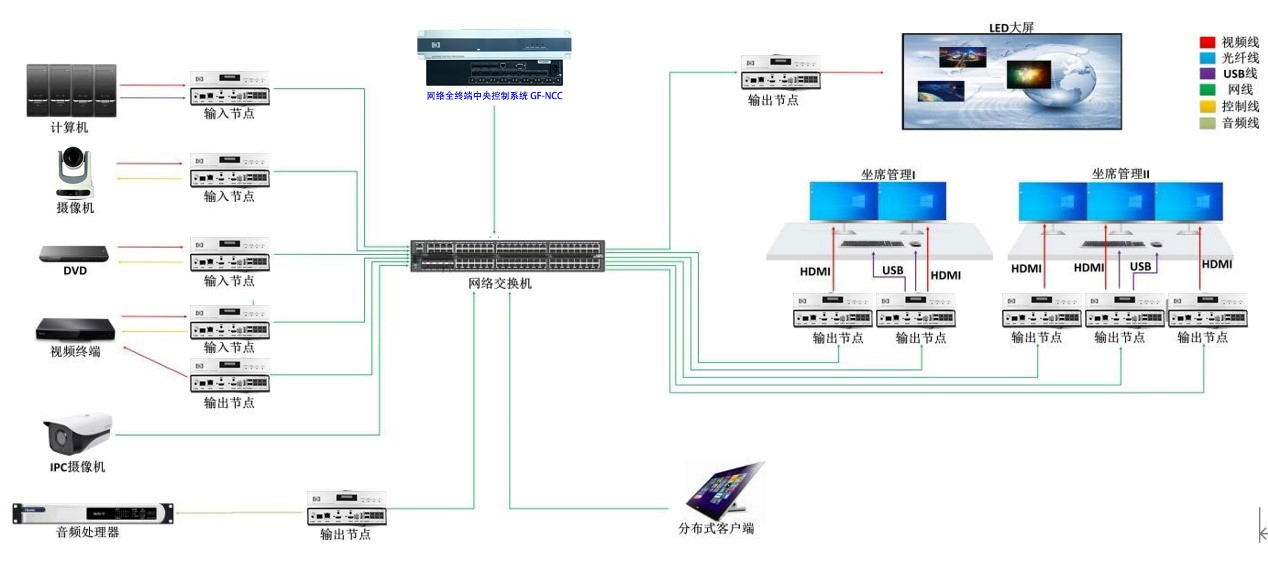控制矩阵信号切换:控制所有信号源输入和分布式节点输入输出信号的切换上屏。