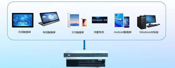 中控主机支持无线触摸屏控制,兼容IOS、Android、windows,以及麒麟、龙芯、磐石、飞腾、申威、MPRC、鸿蒙等国产系统的移动设备,支持windows系统编程软件模拟界面控制。