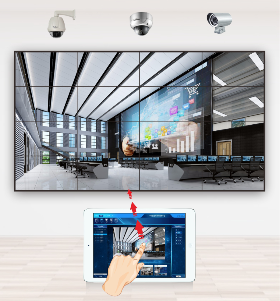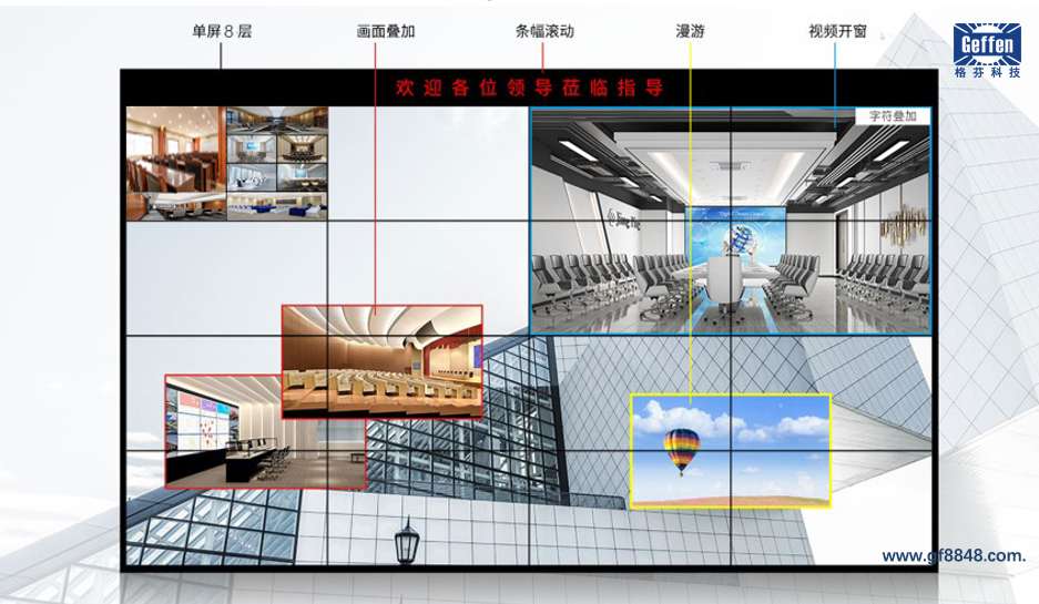 软件管理平台支持对多组大屏拼接处理,支持大屏开窗、整屏显示、漫游、缩放、 任意分割、叠加、黑边补偿等功能。