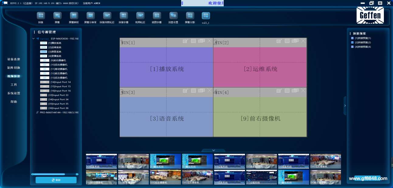 系统支持DP、HDMI、DVI、VGA、CVBS、YUV、SDI、IP、HDbeast、光纤等信号输入。信号支持软件预览功能,同时预览16路信号,支持信号在线监测,支持信号源分组功能。