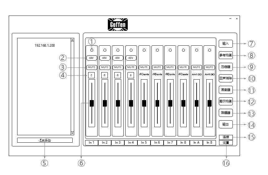 1. 使用GEFFEN Sound Tune 软件(处理器内置)实施对音频信号的参数调节。本处理器接入局域网后,打开PC软件,单击右下角搜索设备,将搜索出所有在线的音频处理设备,并显示对应IP地址(默认IP地址:192.168.1.200),选择本处理器IP地址在右侧界面进行参数调节。