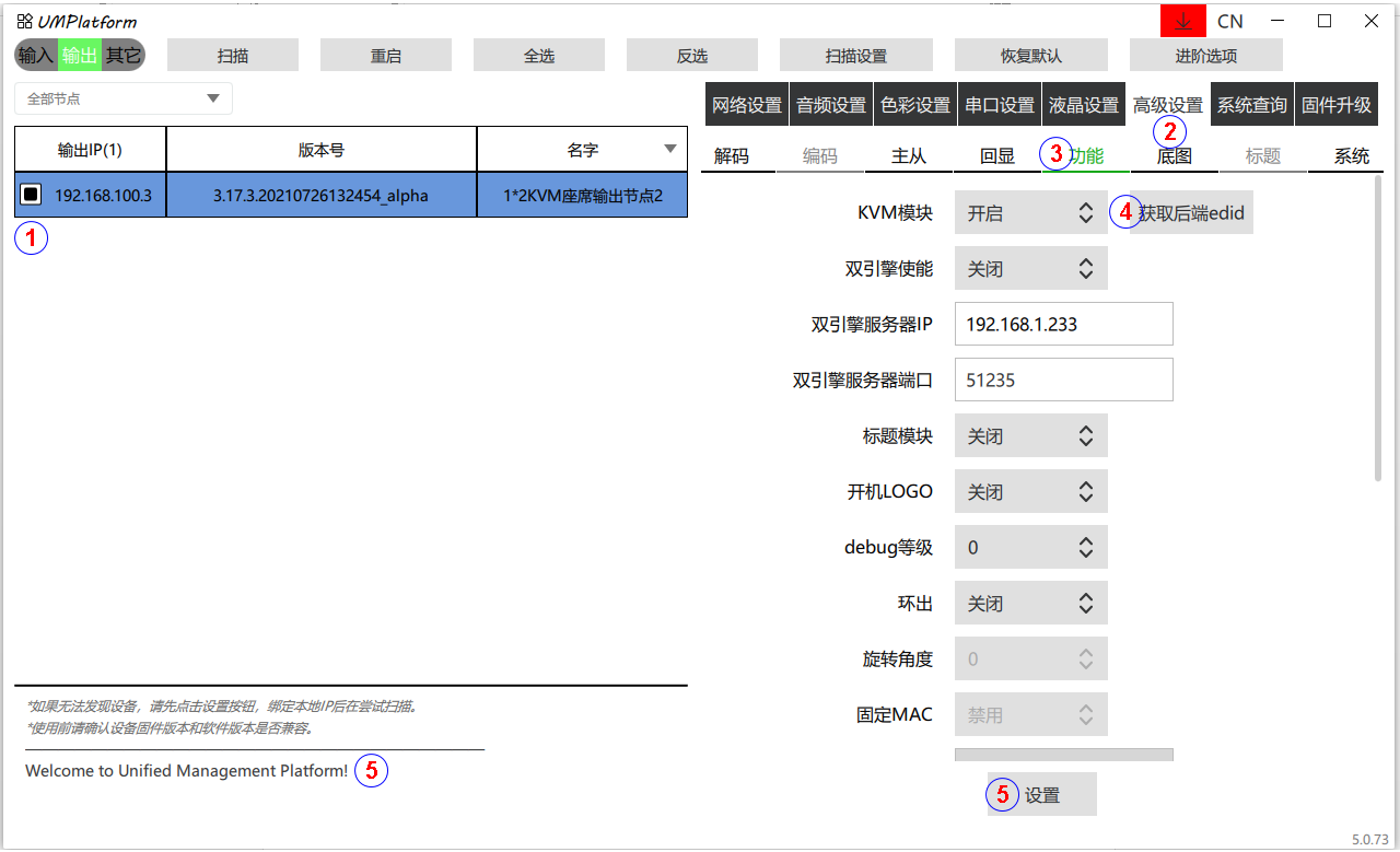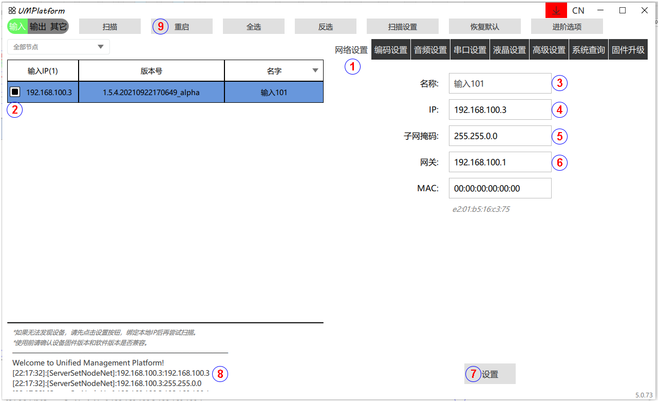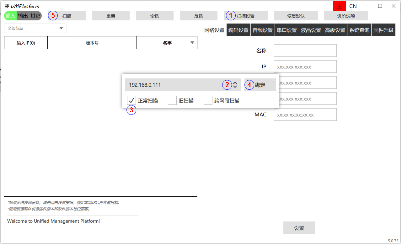 第二步:使用GEFFEN UMP软件进行以下步骤进行扫描发现当前连接的输入和输出IP。