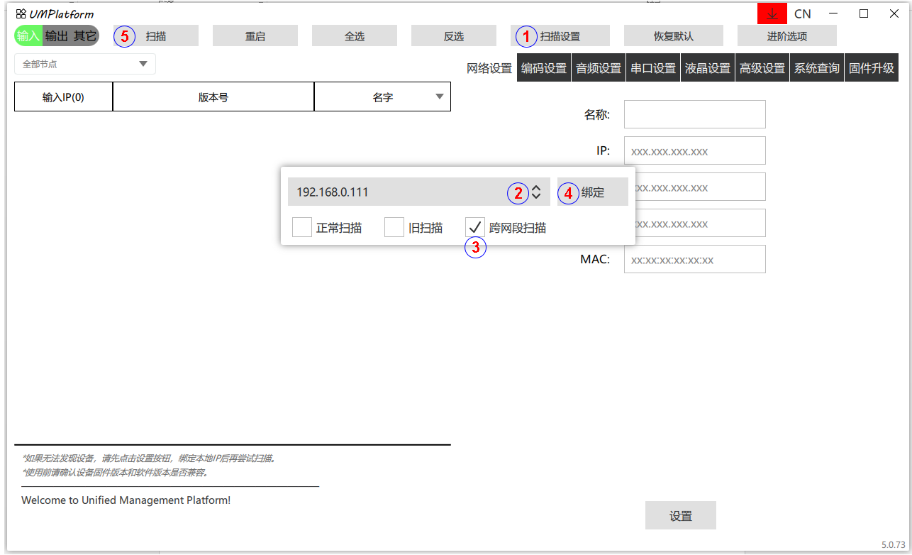 (7) 扫描设置:选择本地网络IP,设置扫描方式。同网段可修改参数,跨网段扫描目的是发现设备。扫描到目标IP后,把本地网络IP设置与目标IP同网段,从而达到可修改参数。