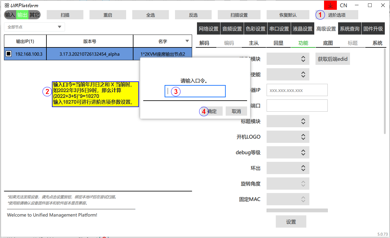 输入口令=当前年月日之和X当前时,如2022年3月5日9时,那么计算(2022+3+5)X 9=18270,输入口令18270,可以进入进阶选项的参数设置。