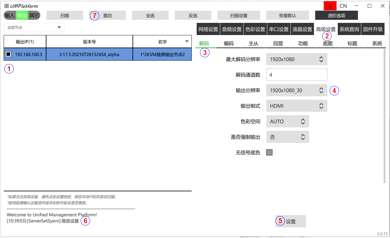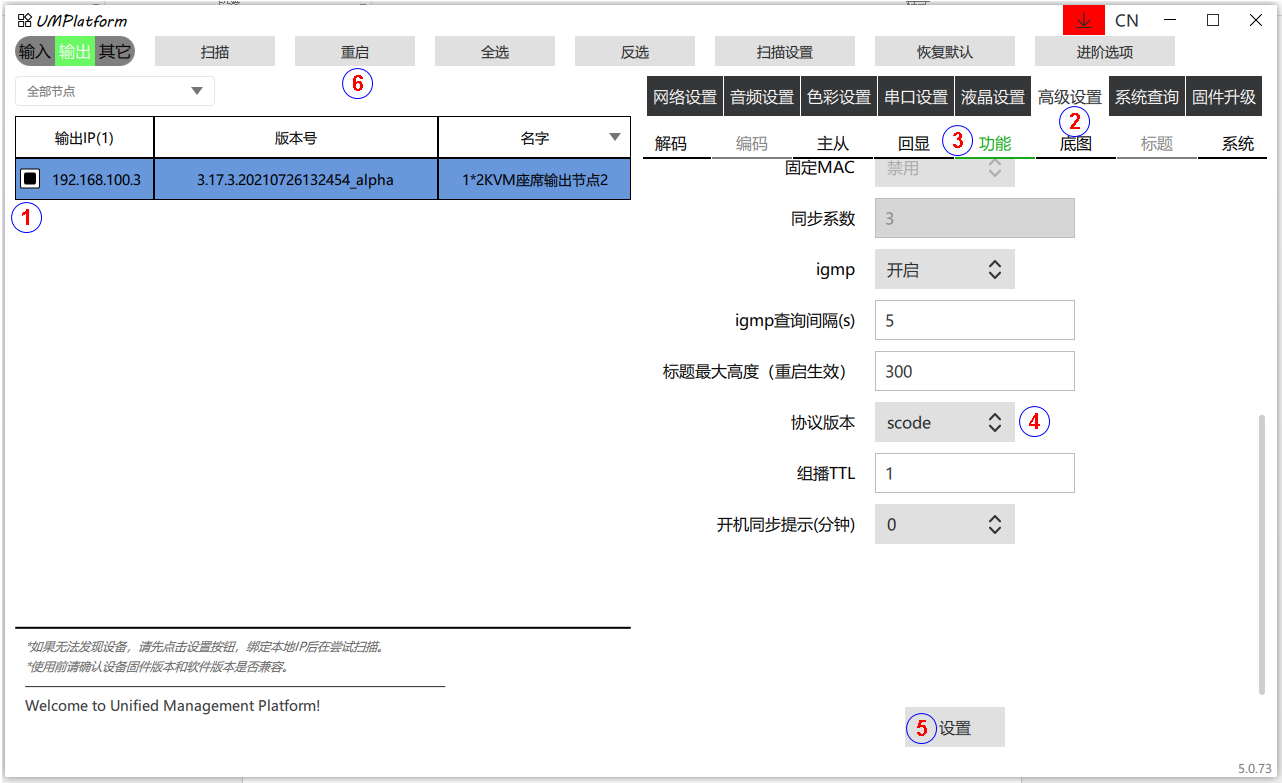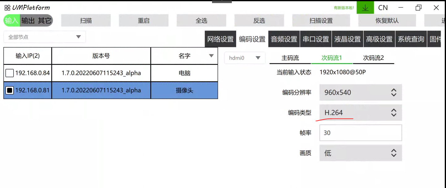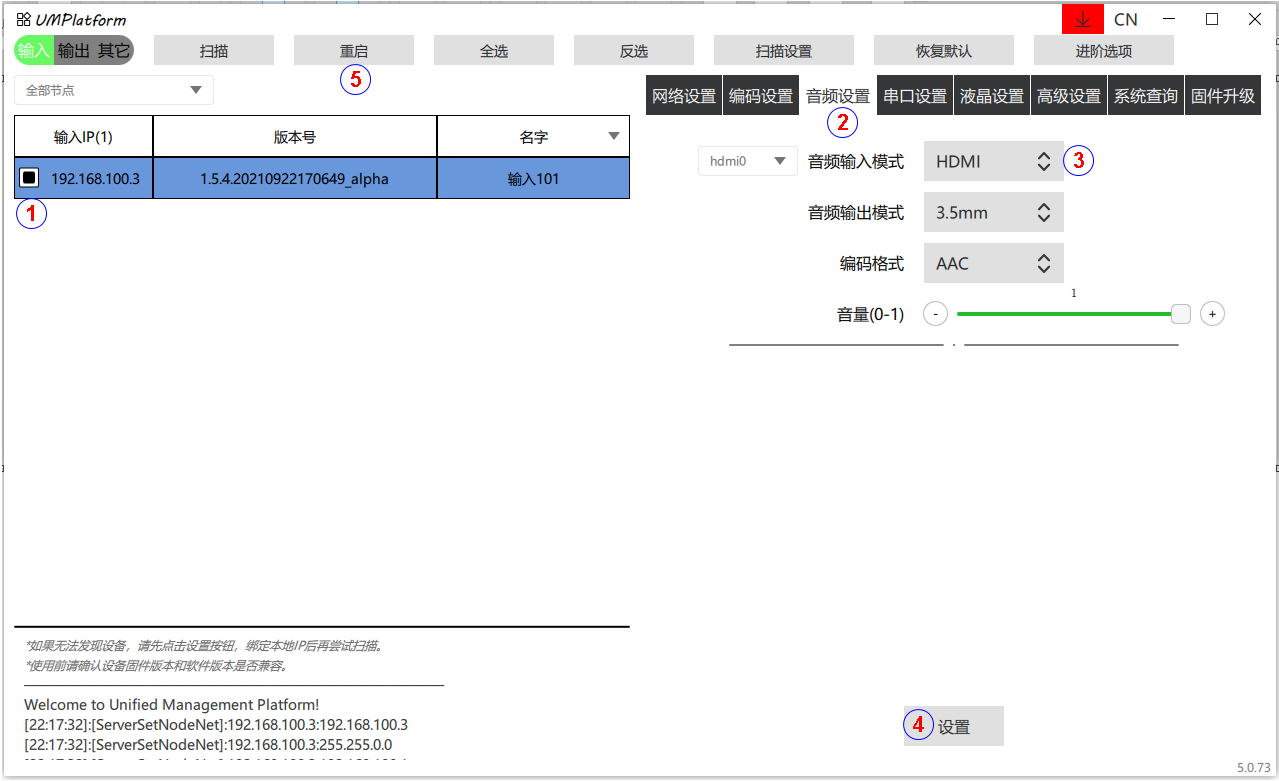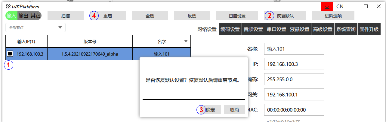 (4) 重启:对当前输入/输出选中的设备进行重启。部分参数修改后或升级后需要重启。