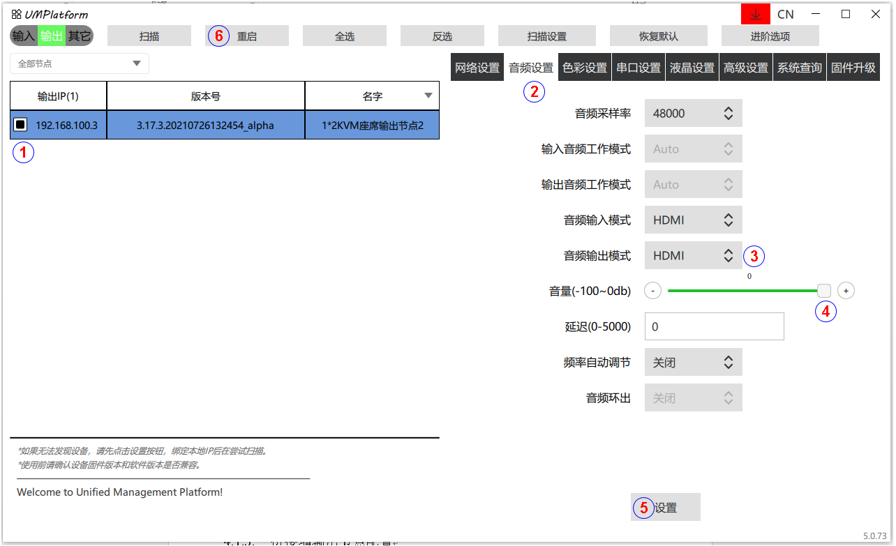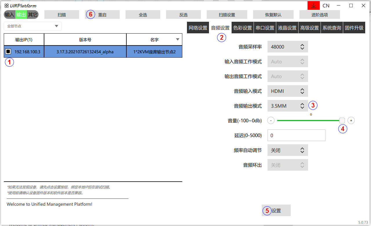 根据现场的音频输出模式选择HDMI输出或者3.5mm(3pin凤凰端子)输出。同时把音量调整到最大(0)。其他参数不用修改。