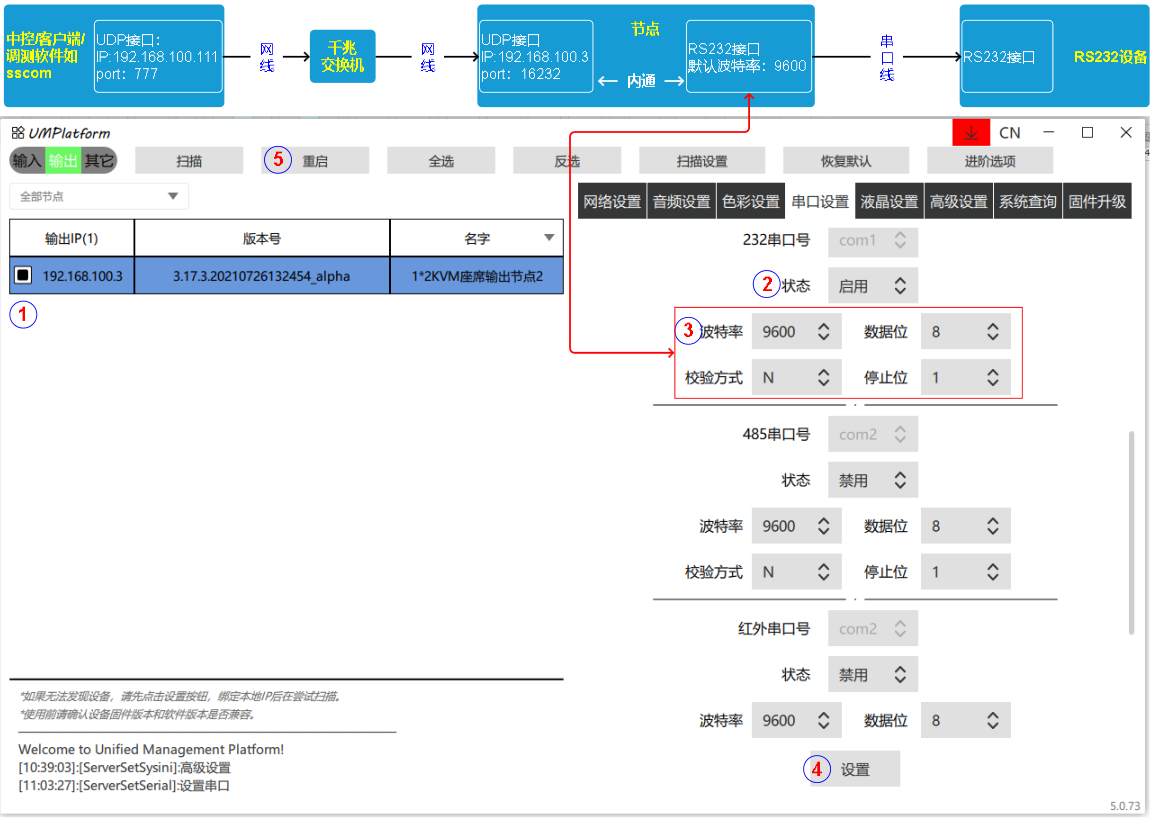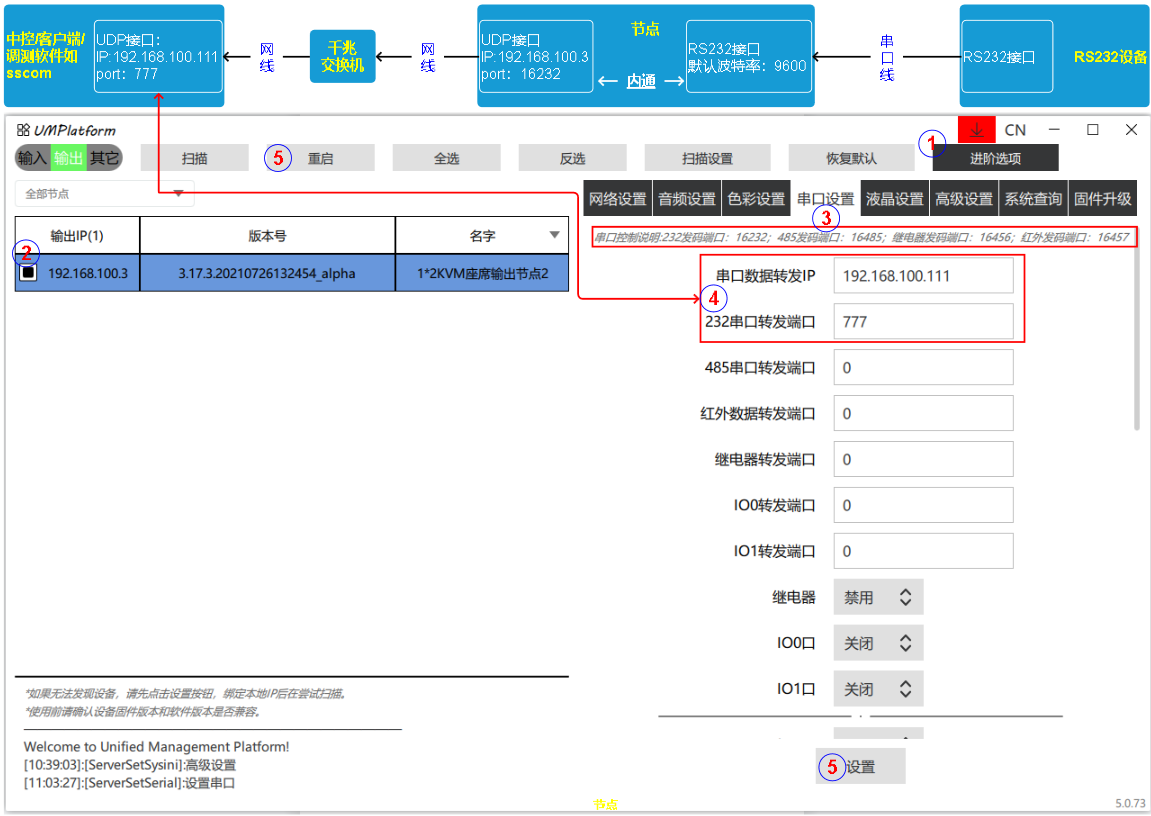 第四步:RS232设备发送串口指令,节点收到串口指令通过网络转发给网络设备,参数设置如下。例:网络设备IP和端口192.168.100.111:777。